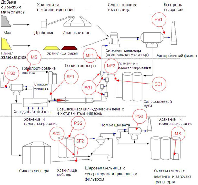 Полный процесс производства цемента показан на следующем рисунке. Участки, где инсталлированы приборы SWR engineering, отмечены красными кружками.